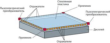 Еще один вариант реализации «сенсорности» связан с использованием поверхностно-акустических волн. Технически подобные тачскрины представляют собой стеклянную панель, где по углам размещены пьезоэлектрические преобразователи, а по краям находятся отражающие и принимающие датчики.