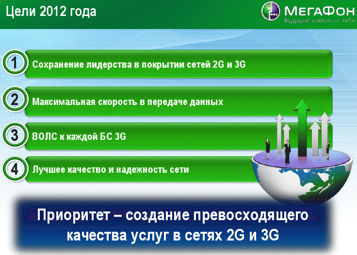 Лучшее качество и надежность сети. Если в 2011 году мы добиваемся превосходства над конкурентами в охвате населения (в покрытии), то в 2012 году лидерство будет за нами и вопросах качества и надежности".