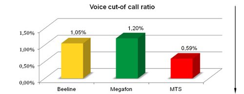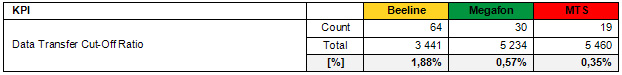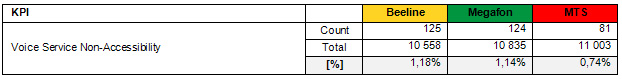 During the tests, more than 32,000 voice calls and 14,000 data connections were made in order to assess the quality of Beeline, Megafon and MTS 3G networks quality across 15 main parameters. The final research report summary covers selected 3G network KPIs including: Voice Cut-off Call Ratio, Voice Service Non-Accessibility, Voice Service Access Time, FTP Mean User Data Rate, FTP IP-Service Access Time and Data Transfer Cut-Off Ratio; all presented below.
