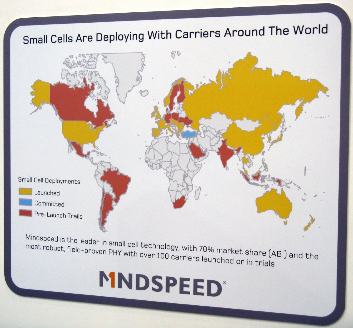 2012.02.28 Стенд компании в 2012 году. Карта внедрений малых сот операторами всего мира. Желтым - где уже внедрены, голубым - планы, красным - предзапусковые испытания. Надпись под картой: "Mindspeed - лидер в отрасли малых сот с долей рынка 70% (оценка ABI), с наиболее надежными решениями, с портфолио, в котором различные проекты испытаний и запусков совместно с более 100 операторов всего мира".