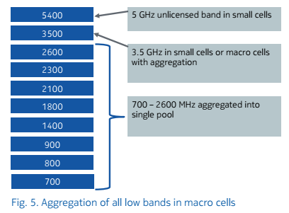На рис. 5 показаны типовые частотные диапазоны, которые будут доступны операторам мобильной связи Европы в ближайшем будущем. Будут агрегироваться преимущественно частоты от 700 до 2600 МГц с целью ускорить управление трафиком. Кроме того, могут будут задействованы частоты 3.5 ГГц, если шаг размещения сайтов LTE будет соответствовать требованиям к созданию эффективного покрытия систем LTE 3.5 ГГц.