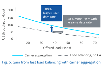 Пунктирная линия показывает скорость передачи данных, доступную пользователю, как функцию нагруженности системы с использованием полосы 20 МГц. Кривая подразумевает, что балансировка нагрузки осуществляется в начале пакетного "вызова". Голубая линия показывает скорости, которые будут доступны пользователю в случае, если агрегируются полосы 20+20 МГц и все абонентские устройства поддерживаются этот функционал. Скорости, доступные пользователю существенно выше, примерно на 80%, даже при высокой загрузке. В качестве альтернативы, можно поддерживать ту же доступную среднюю скорость для пользователей, но обслуживать одновременно больше пользователей. В этому примере, можно ожидать выигрыша на 40% в нагрузочной способности, при обеспечении им тех же средних скоростей.