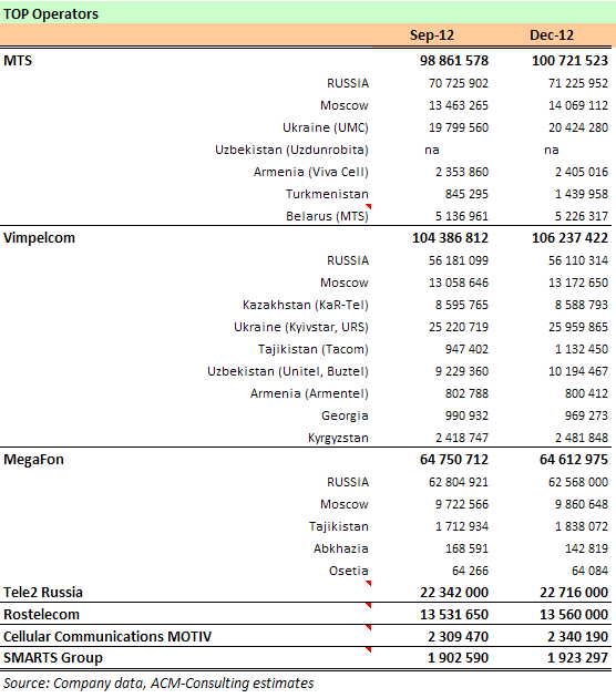 Согласно отчету исследовательской компании AC&M Consulting, в IV квартале 2012 года общее число абонентов российских мобильных операторов увеличилось на 670 тысяч человек. Уровень проникновения мобильной связи в стране составил 161,3%.