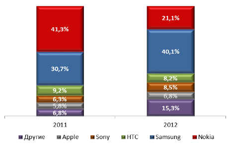Рис. 7. Доля смартфонов на рынке мобильных телефонов, 2011-2012
