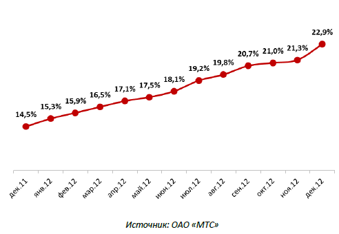 Уровень проникновения смартфонов в операторской сети МТС по итогам 2012 года приблизился к 23%, увеличившись за год более чем в полтора раза.