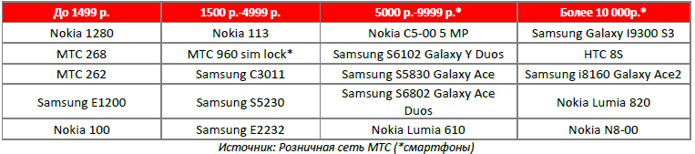 В топ-5 самых продаваемых брендов смартфонов в рознице МТС по результатам 4 квартала 2012 года вошли Samsung, Nokia, МТС, Sony и HTC.