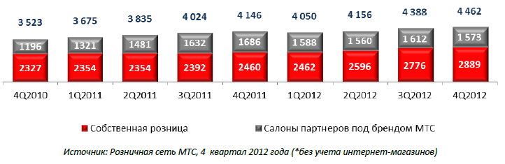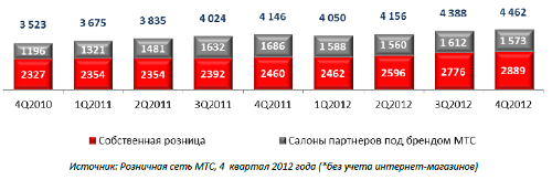 Количество салонов Розничной сети МТС (с учетом партнеров, работающих под брендом МТС) на конец 4 квартала 2012 года составило 4 462, из которых 71 - флагман.