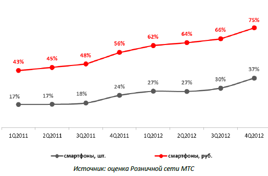 По результатам 4 квартала 2012 года на российском рынке было продано 4,3 млн смартфонов – на 51% больше в сравнении с 4 кварталом 2011 года. Доля смартфонов в общем количестве проданных мобильных телефонов (11,7 млн аппаратов) составила 37%, превысив на 13 п.п. значение 4 квартала 2011 года.