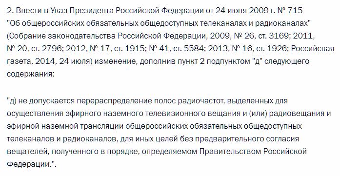 2013.08 Начал действовать указ президента РФ, запрещающий перераспределять частоты, выделенные для эфирного вещания без согласия вещателей.