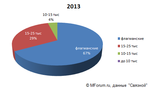 В 2013 году 67% реализованных смартфонов с LTE являлись флагманскими, еще 29% продавались в высоком ценовом сегменте (15-25 тысяч рублей), 4% были доступны в категории 10-15 тысяч рублей, то есть в среднем ценовом сегменте.