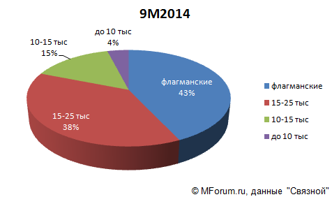 По итогам 9М2014 доля LTE-смартфонов в категории 10-15 тыс. рублей выросла почти в 4 раза, до 15% в штуках, доля высокого ценового сегмента - до 38%. Соответственно снизилась доля флагманских устройств - до 43% по итогам 9М2014. Такие ценовые изменения неизбежно ведут к расширению рынка. В частности, продажи флагманских моделей с начала 2014 года выросли на 23% с 840 тысяч до 1,03 млн.