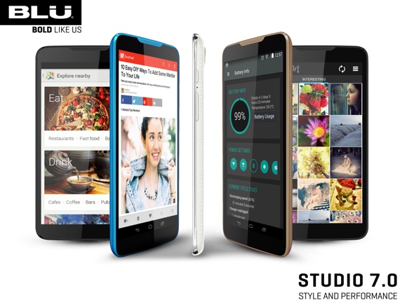 BLU Studio 7.0 оснащен 7-дюймовым экраном с разрешением 1024 x 600 пикселей, чипсетом MediaTek с 2-ядерным процессором с частотой 1.3 ГГц, графическим процессором Mali 400 и 1 ГБ оперативной памяти, поддержкой четырех диапазонов GSM/GPRS/EDGE, 21Mbps HSPA+, 8 ГБ встроенной памяти, расширяемой с помощью съемных карт памяти microSD, 5 мп основной и 2 мп фронтальной камерами и работает на ОС Android 4.4.2 KitKat.