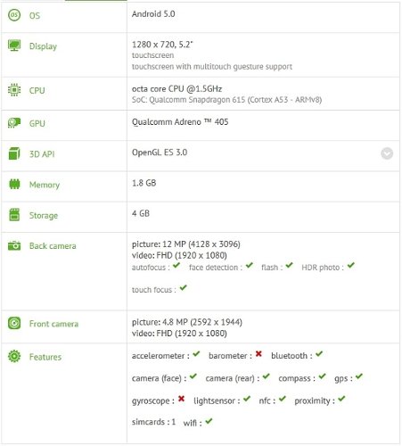 Другие спецификации новинки включают в себя 5.2-дюймовый экран с разрешением 720p, 1.8 ГБ оперативной памяти, 12 мп основную камеру с максимальным разрешением 4128 x 3096 пикселей и возможностью записывать видео в формате Full HD, 5 мп фронтальную камеру с разрешением 2592 x 1944 пикселей и ОС Android 5.0 Lollipop.