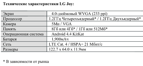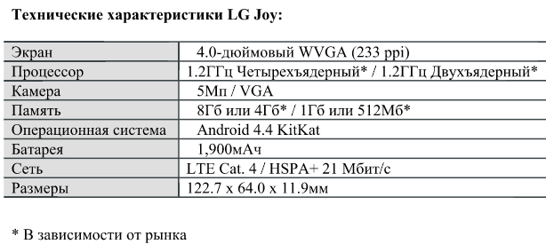 LG Joy – самый маленький смартфон из представленных Диагональ его экрана составляет 4 дюйма при разрешении WVGA. В зависимости от рынка, смартфон оснащен 2- или 4-ядерным процессором, 512 МБ или 1 ГБ оперативной памяти, 4 или 8 ГБ встроенной памяти. Используемая операционная система - Android 4.4 или Android 5.0. Размеры LG Joy составляют 122.7 x 64.0 x 11.9 мм, емкость аккумулятора – 1900 мАч.