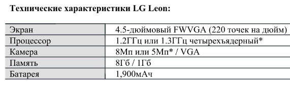 LG Leon получил 4.5-дюймовый экран с разрешением FWVGA и аккумулятор емкостью 1900 мАч. Размеры новинки - 129.9 x 64.9 x 10.9 мм.