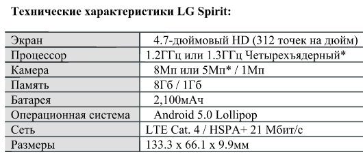 LG Spirit обладает сходным набором параметров, но диагональ экрана составляет 4.7 дюйма при разрешении 720p, а емкость аккумулятора – 2100 мАч. Размеры смартфона - 133.3 x 66.1 x 9.9 мм.
