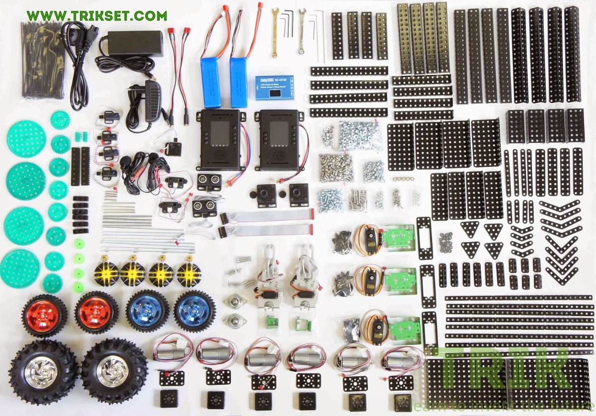Кибернетический конструктор ТРИК, Россия. Набор для прототипирования робототехнических моделей, базовые приводы, сенсоры. Совместим с металлическим конструктором с перфорацией под M4 и шагом 10 мм. В набор входит контроллер ТРИК, видеокамера и микрофон. Примеры наборов.