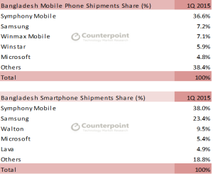 Кроме того, успехом в Бангладеш пользуются смартфоны Microsoft Lumia (535 и 532) занимающие 4 место в общем зачете с рыночной долей 5,4%.