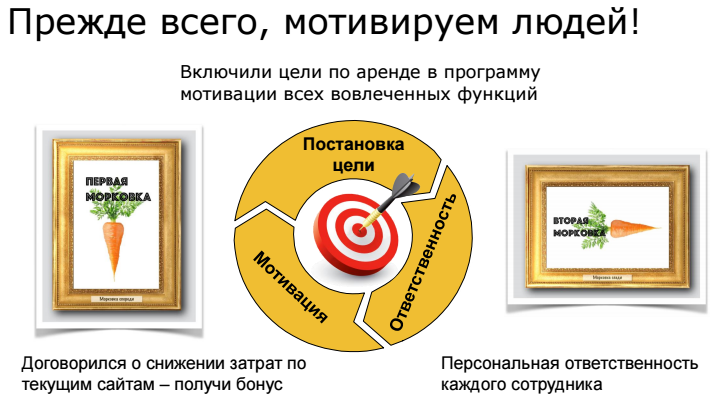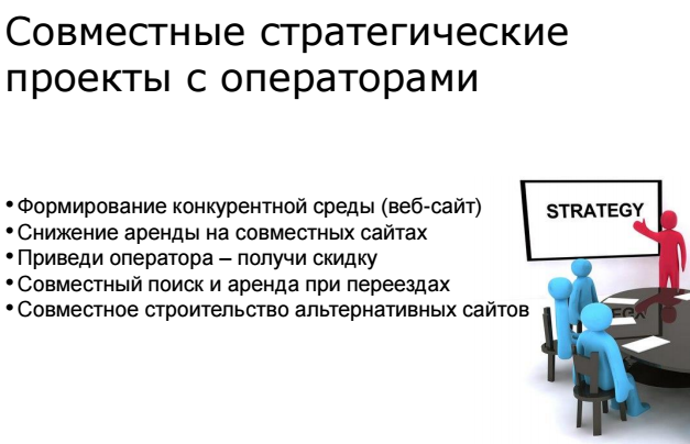 Первое, что должно осесть в головах наших сотрудников, что такая возможность как стратегические проекты с операторами, есть в принципе. Руководители функций в свою очередь должны обеспечить, чтобы это все работало. Практика показывает, что процесс этот сложно настроить. Люди "обжигаются". Раз попробуют, что-то у них не получится, и более уже и не пробуют. Именно поэтому в Билайн сейчас за каждой инициативой стоит конкретная фамилия. Важно, чтобы люди на местах понимали, что "наверху" в каждой компании эти инициативы одобрены, что можно и нужно действовать на местах совместно в вопросах аренды, если это позволит компании добиваться повышения эффективности за счет снижения ставок аренды.