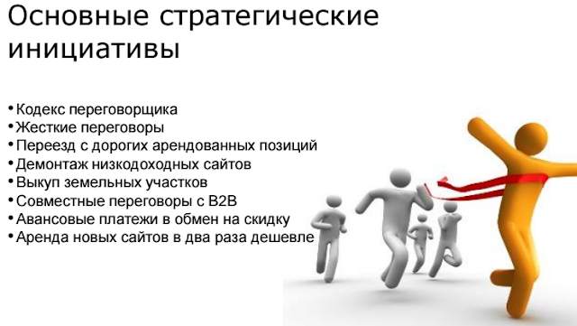 Привлечение функций. Это участие B2B, финансов в переговорах с арендодателями. Например, B2B может делать предложения, которые для арендодателя будут восприниматься, как уникальные и очень необходимые. Здесь конечно очень индивидуально должны решаться вопросы, "коврово" на всю сеть не раскатаешь такие кейсы. Но это еще один вариант в арсенале наших переговорщиков. Финансы могут помочь, например, в использовании такого фактора убеждения, как авансовые платежи.