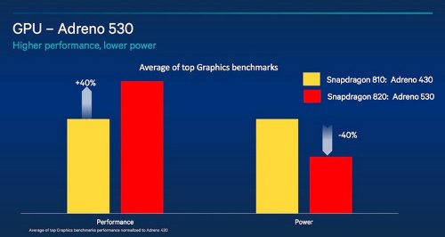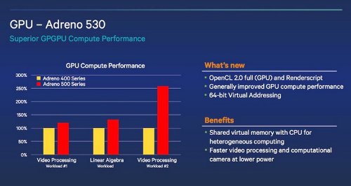 Во время презентации основной внимание было уделено двум ключевым моментам. Первый – обновленный графический чип Adreno 530. Производитель заявляет о 40% росте производительности и 40% снижении уровня энергопотребления. Также отметим поддержку OpenGL ES 3.1 + AEP (Android Extension Pack), Renderscript, OpenCL 2.0, Vulkan, а также вывод 4К-видео при 60 кадрах в секунды через HDMI 2.0 и беспроводную передачу 4К-видео (при 30 кадрах в секунду).