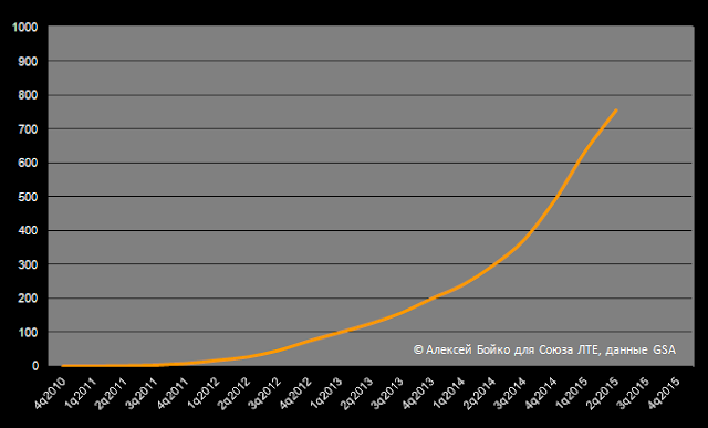 По данным GSA, основанным на оценкам аналитиков Ovum Ltd., число подключений к сетям LTE в мире по итогам 2q2015 составило 755 млн на 30 июня 2015 года. Абонентская база сетей LTE растет быстрее, чем это было с любой другой технологией мобильной связи в современной истории.