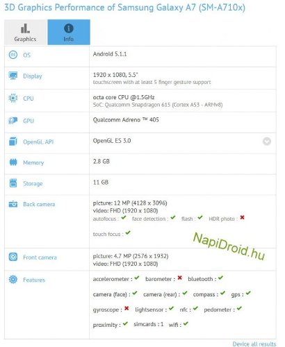 По данным бенчмарка вторая новинка, SM-A710 (претендент на звание обновленного Galaxy A7), получит 5,5-дюймовый дисплей разрешением 1920х1080 точек, чипсет Snapdragon 615, 3 Гб ОЗУ и 16 Гб встроенной памяти. Разрешение камер и версия ОС аналогичны SM-A310. Изображения новинок пока отсутствуют.