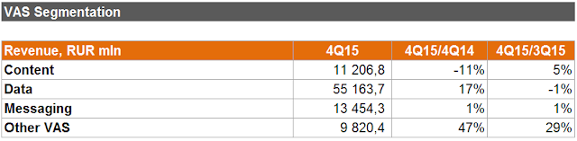 Доходы от контента год к году сокращаются, от ШПД - растут. Правильно. Оператор должен быть трубой для данных, а не участником рынка продаж контента. Рост Other VAS должен показывать, что операторы все же могут пытаться зарабатывать и на других допуслугах.