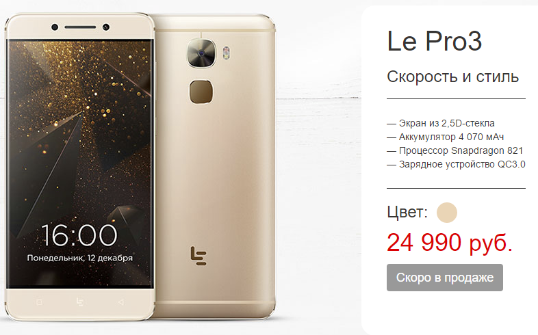 В активе Le Pro3 присутствуют 5,5-дюймовый дисплей разрешением 1920х1080 точек с защитным стеклом Gorilla Glass 3, 4 Гб ОЗУ, 32 Гб встроенной памяти и аккумулятор емкостью 4070 мАч. Фоточасть новинки включает в себя 16 Мп тыловую камеру с апертурой f/2.0 и 8 Мп камеру на передней панели. Также можно отметить поддержку NFC, LTE, технологии Dolby Atmos, дактилоскопический сенсор и порт USB Type C. Работает Le Pro3 под управлением EUI 5.8 на базе Android 6.0. Цена на российском рынке – 24 990 рублей, что делает этот аппарат весьма привлекательным.