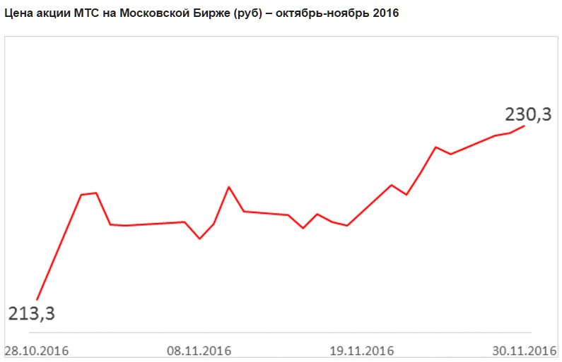 495 бумаг у мажоритарного акционера АФК "Система" на сумму 355,1 млн рублей. Программа приобретения акций оказалась не полностью выбранной из-за роста стоимости акций МТС на рынке в октябре-ноябре 2016 года. С момента объявления о начале программы приобретения, стоимость акции МТС на Московской бирже выросла до 230,30 рублей с 213,30 рублей, что выше максимально возможной премии в 7,4%, установленной к цене закрытия на 28 октября 2016 года.