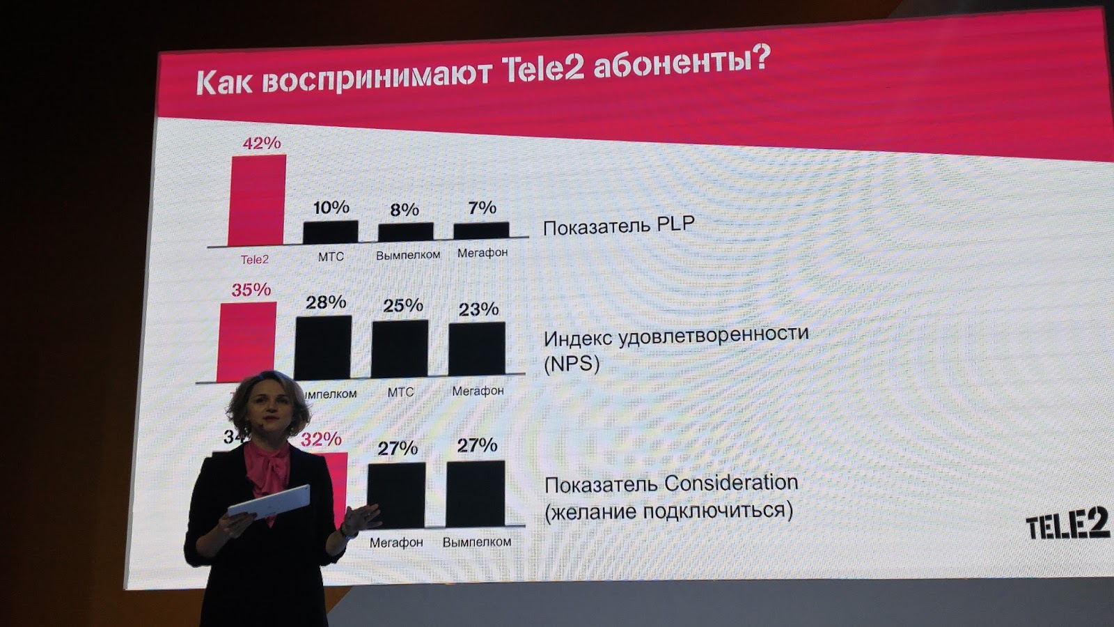 Показатель, к которому трепетно относится практически любая компания на современном рынке, это NPS (АБ: net promoter score - индекс лояльности). Здесь Tele2 безусловно есть, чем гордиться. У нас самый высокий показатель индекса удовлетворенности на российском рынке телекома. Это то, что говорят наши абоненты.
