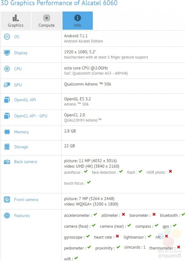 По информации GFXBench в активе смартфона Alcatel 6060 (предполагается, что именно за этим модельным номером скрывается Alcatel Idol 5) будут присутствовать 5,2-дюймовый дисплей разрешением 1920х1080 точек, чипсет MediaTek MT6757CH (Helio P20), 2 Гб ОЗУ, 32 Гб встроенной памяти, поддержка NFC, а также связка 12 Мп тыловой и 8 Мп фронтальной камер.