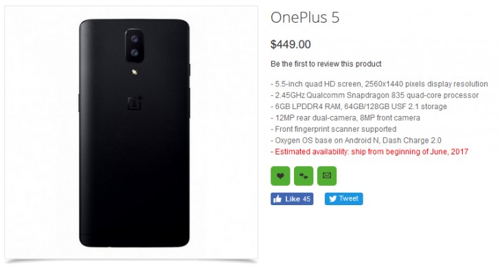 Крупный ритейлер OppoMart раскрыл внешность, спецификации и цену смартфона OnePlus 5. Впрочем, данные о внешности и спецификациях стоит считать предварительными. В качестве картинки использован рендер задней панели смартфона, а набор параметров выглядит как компиляция появляющихся ранее слухов. Ожидается, что новинка появится в продаже в июне 2017 года по цене $449.