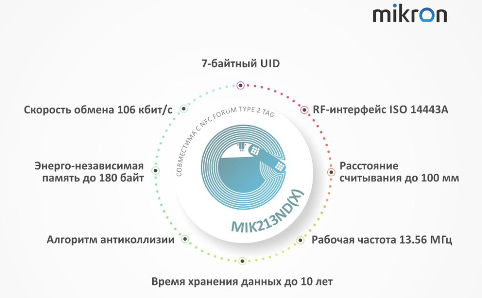 Микросхема MIK213ND, разработанная АО "НИИМЭ" и производимая зеленоградским предприятием Микрон, предназначена для изготовления NFC-меток для маркировки различных объектов, включая металл. MIK213ND соответствует спецификациям NFC Forum Type 2 Tag. Это первый отечественный чип с NFC-интерфейсом, который можно считывать любым устройством с NFC-модулем, например, смартфоном. Микросхема уже используется в составе меток, которыми снабжается продукция "Микрон".