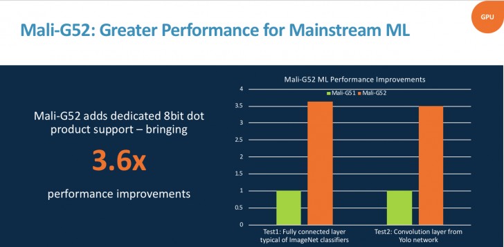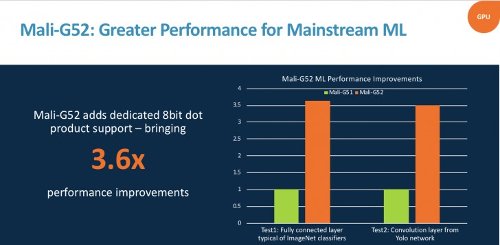 Не забыта и актуальная тема машинного обучения (AI), для которой заявлен прирост производительности в 3,6 раза. В части графики ядро G52 может обрабатывать 2 пикселя и 2 текселя за такт, при этом на одном графическом процессоре может быть от 1 до 4 ядер. А благодаря дополнительным блокам управления шейдером новые ядра будут получать от 50% до 100% больше FLOPS на ядро.