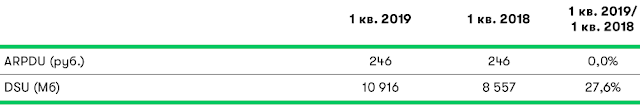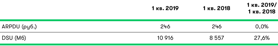 В 1 квартале 2019 года показатель ARPDU остался на уровне аналогичного периода прошлого года и составил 246 рублей.
