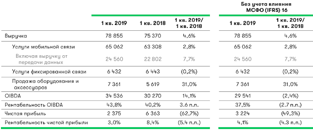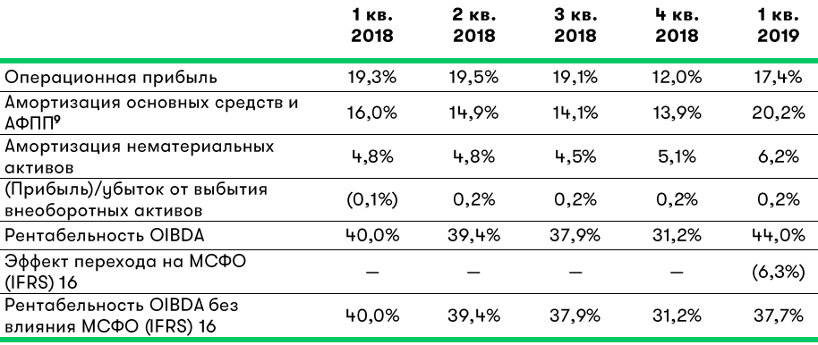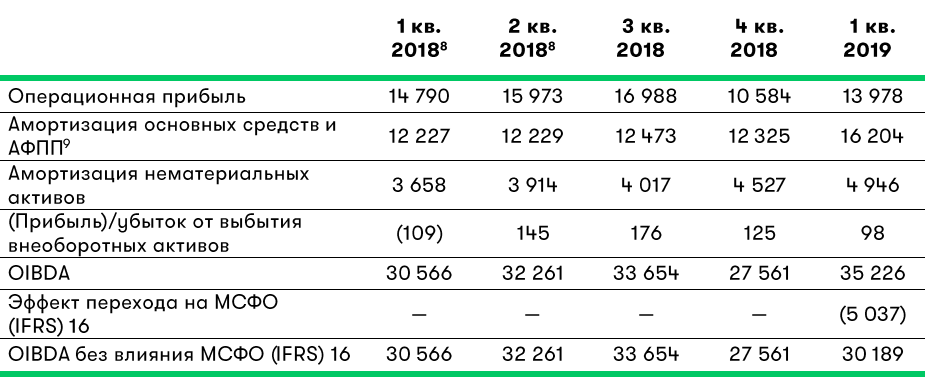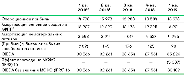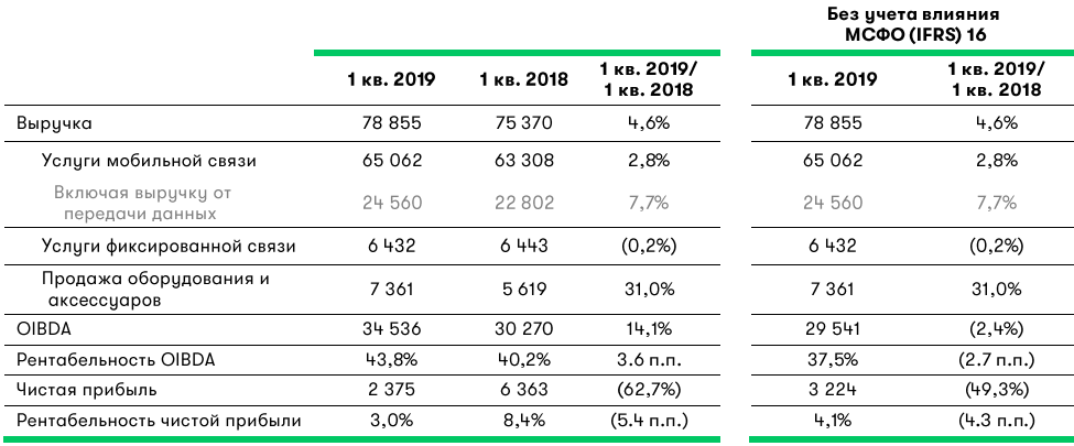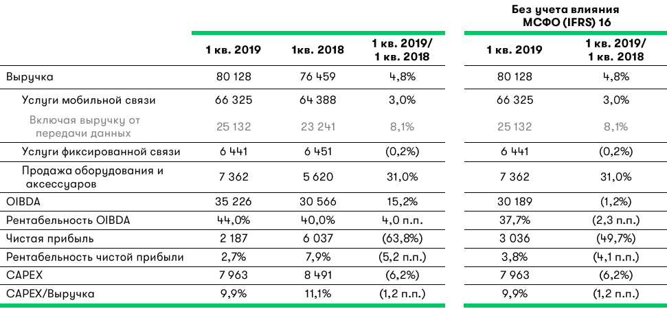 В 1 квартале 2019 года показатель OIBDA вырос на 15,2% по сравнению с аналогичным периодом прошлого года до 35 226 млн руб.; рентабельность OIBDA выросла на 4,0 п.п. по сравнению с аналогичным периодом прошлого года и достигла 44,0%. Рост показателей включает положительный эффект от применения МСФО (IFRS) 16 в сумме 5 037 млн руб. Без учета эффекта МСФО (IFRS) 16 показатель OIBDA снизился на 1,2% до 30 189 млн руб. по сравнению с прошлым годом; рентабельность OIBDA без учета влияния МСФО (IFRS) 16 снизилась на 2,3 п.п. до 37,7%.