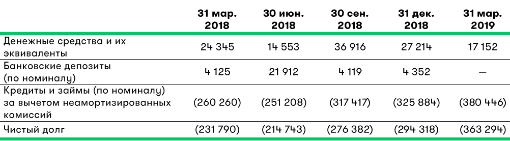Чистый долг вырос на 23,4% с 294 318 млн руб. на 31 декабря 2018 года до 363 294 млн руб. на 31 марта 2019 года в связи с дополнительным финансированием обязательного предложения о выкупе акций, Соотношение чистого долга к OIBDA составило 2.94х.