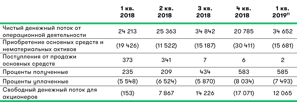 Свободный денежный поток для акционеров определяется как сумма денежных средств от операционной деятельности за вычетом сумм, направленных на приобретение основных средств и нематериальных активов и выплату процентов, увеличенная на поступления от продажи основных средств и полученные проценты. Это финансовый показатель, который должен рассматриваться в дополнение, а не как альтернатива информации, содержащейся в финансовой отчетности Группы. Сопоставление показателя свободного денежного потока и суммы денежных средств, полученных от операционной деятельности, приведено в Приложении 2.