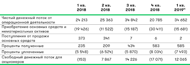 Свободный денежный поток для акционеров в 1 квартале 2019 года вырос на 12 218 млн руб. по сравнению с аналогичным периодом прошлого года до 12 065 млн руб. Рост показателя связан с увеличением операционного денежного потока и более низкими выплатами по капитальным расходам в этом году.