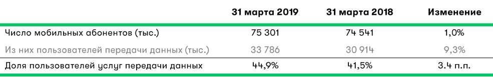 На 31 марта 2019 года число абонентов мобильной связи в России увеличилось на 1,0% по сравнению с прошлым годом до 75,3 млн человек в основном за счет роста абонентской базы пользователей услуг передачи данных на 9,3% до 33,8 млн человек. Основным фактором роста стал маркетинговый фокус на клиентах, пользующихся услугами передачи данных, в том числе посредством целевых маркетинговых кампаний, включая акции «Купи один смартфон Samsung, получи другой бесплатно», «Гигатека», а также развитие продуктовой линейки в рамках тарифов «Включайся!».
