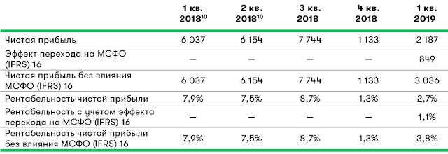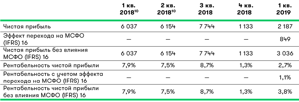 В 1 квартале 2019 года чистая прибыль снизилась на 63,8% по сравнению с аналогичным периодом прошлого года до 2 187 млн руб. Исключая эффект от перехода на МСФО (IFRS) 16 в размере 849 млн руб. чистая прибыль снизилась на 49,7% по сравнению с прошлым годом до 3 036 млн руб. Основным фактором снижения стал рост финансовых расходов на 33,0% в результате финансирования Программы выкупа акций и ГДР, завершившейся в сентябре 2018 года, о также в связи с обязательным предложением о выкупе акций, который был осуществлен в 1 квартале 2019 года.