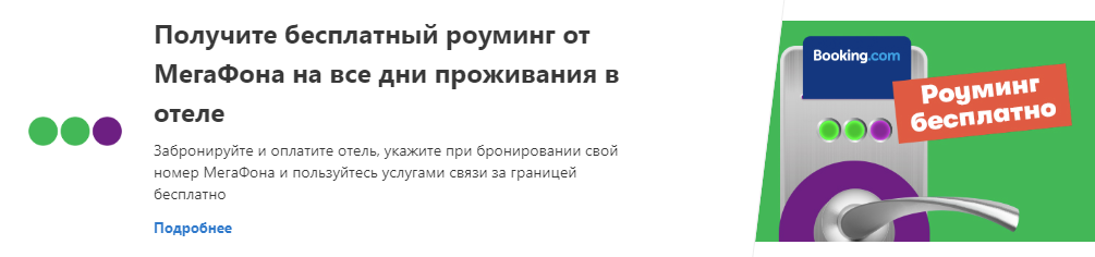 Новый проект МегаФона совместно с Booking.com выгодно отличается от мало востребованных предложений типа "пополни бонусами продуктового магазина счет мобильного телефона". Речь идет о возможности бесплатно воспользоваться услугами мобильного интернета и голосовой связи в зарубежном роуминге, в 130 странах. Очень любопытное предложение, учитывая насколько популярным стало пользование таким сервисом, как Booking.com.