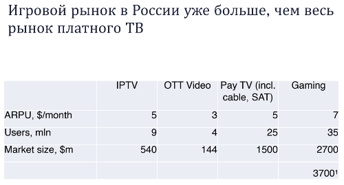 Операторы не сразу обратили внимание на такой интересный и перспективный рынок, как онлайн-гейминг. Они традиционно уделяли внимание платному ТВ, куда менее перспективному направлению. Между тем, число онлайн-геймеров в России в 2019 году оценивается на уровне более 30 млн человек - появление доступных облачных технологий обеспечит дальнейший рост числа геймеров. И если уже сейчас средний ARPU онлайн-геймера составляет $5, то в перспективе эта цифра может существенно вырасти. Не удивительно, что операторы уделяют этому направлению все более существенное внимание.