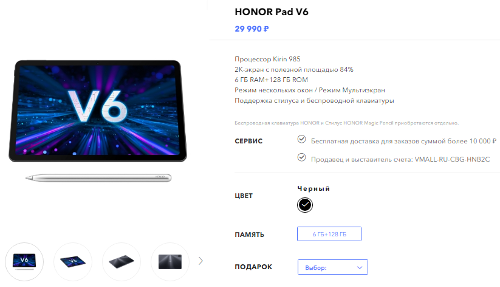 Ключевые спецификации Honor Pad V6 включают в себя 6 Гб ОЗУ, 128 Гб встроенной памяти, 13 Мп тыловую и 8 Мп фронтальную камеры, а также АКБ емкостью 7250 мАч. Купить новинку можно будет с 18 сентября, ее цена составит 29 990 рублей. Цветовая гамма модели включает в себя лишь один вариант – черный. В качестве подарка за предзаказ с 4 по 17 сентября можно получить стилус Honor Magic-Pencil, беспроводную клавиатуру Honor Wireless Keyboard или наушники.