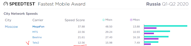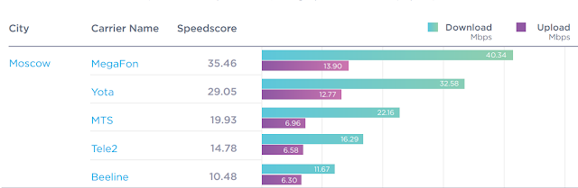Обратите внимание - у МегаФон средние скорости скачивания данных в Москве выросли с 40,3 Мбит/c до 48,5 Мбит/с, а у Tele2, например, немного снизились - с 16,3 до 15,98. Кстати, именно средние скорости в ближайшие годы начнут снижаться, если в России не будут созданы условия, которые позволят операторам начать широкомасштабные запуски сетей 5G.