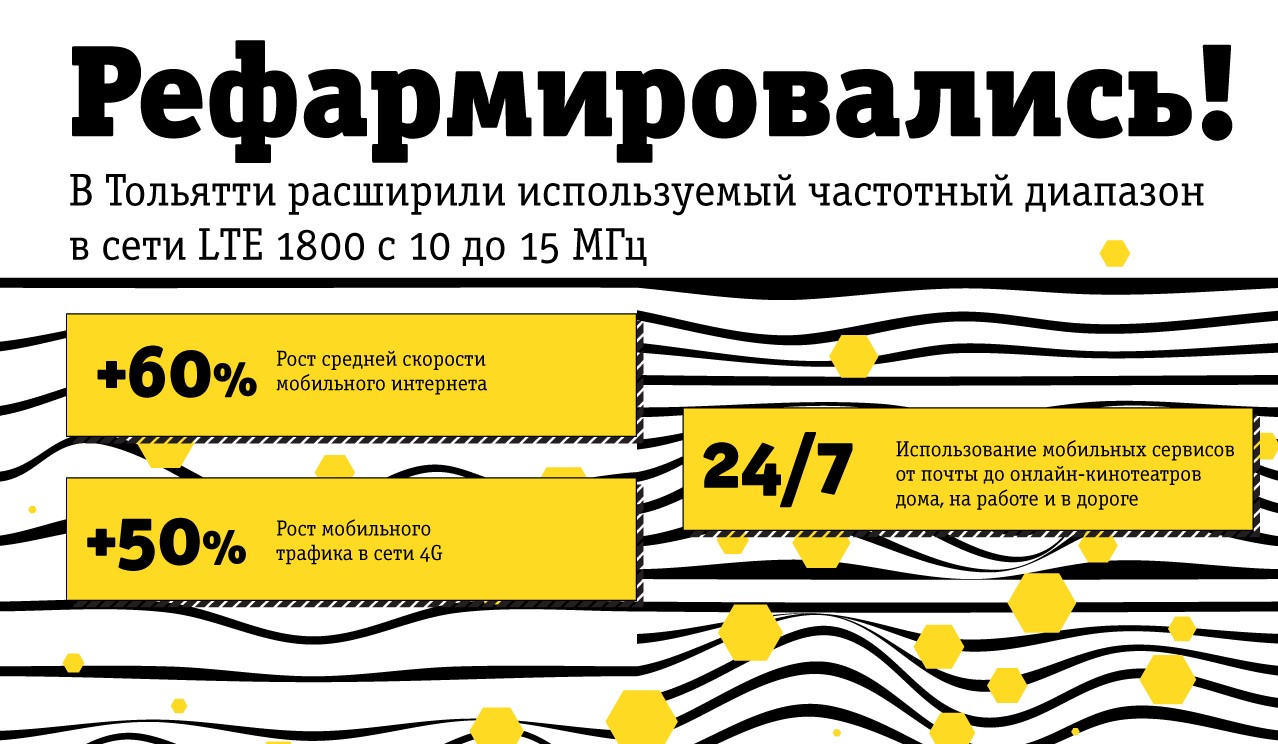 Билайн объявил о завершении масштабного проекта в Тольятти по улучшению скоростных параметров в сети 4G/LTE. Повышения доступных скоростей оператор добился за счет рефарминга еще 5 МГц в диапазоне 1800 МГц для использованию сетью LTE. Теперь сеть LTE1800 работает с полосой 15 МГц. Оператор заявляет о росте средних скоростей, доступных жителям в Тольятти почти на 60%.