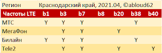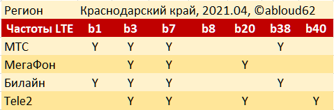 Частоты, используемые в Краснодарском крае операторами LTE: