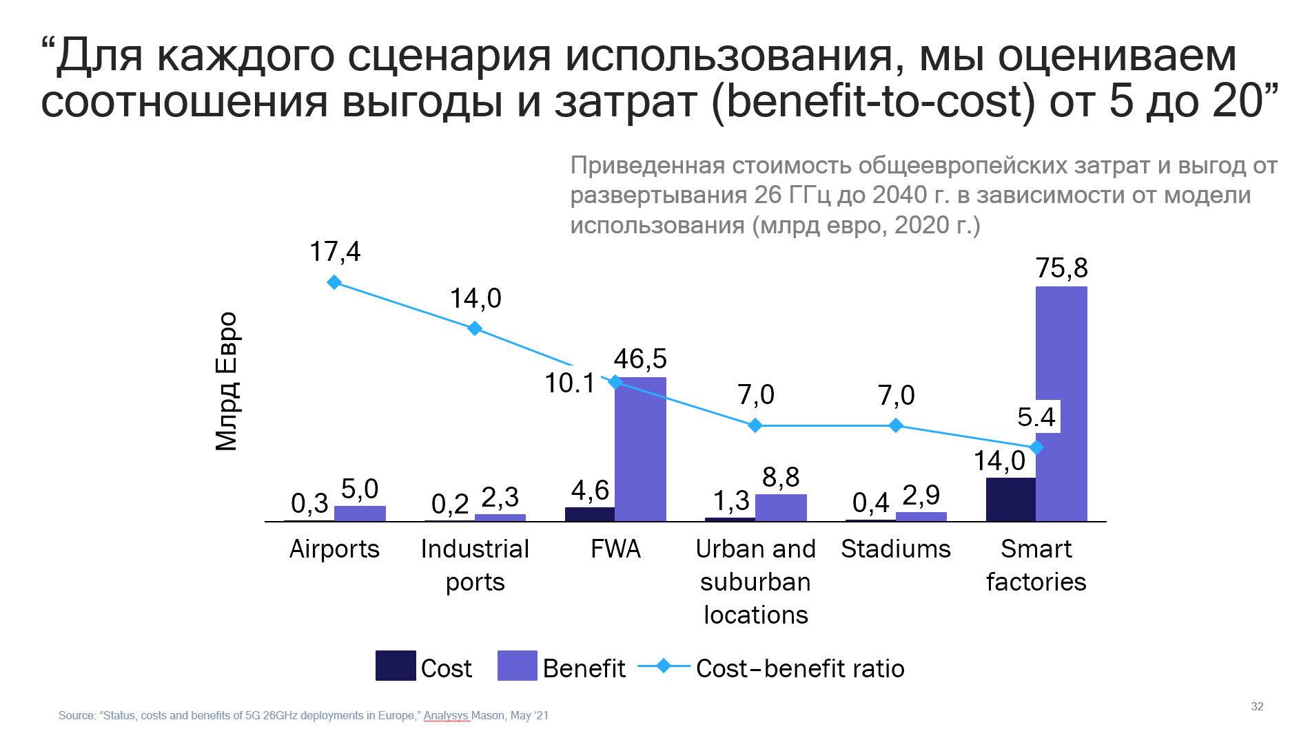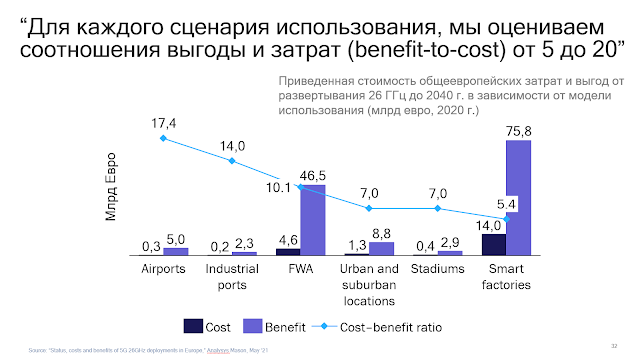 Аналитики из Analysys Mason в мае 2021 года провели исследование и поделились его результатами. Они, в частности, прогнозировали затраты на сооружение и эксплуатацию сетей 5G mmWave (cost) и возможные доходы от таких сетей (benefit). Для каждого сценария было рассчитано соотношение затрат к доходам (cost-benefit ratio), - его отображает на графике ломаная линия голубого цвета. Как видим, оно колеблется от 5,4 до почти 18.