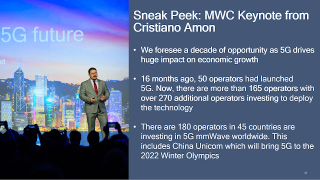 Кристиано Амон также отметил, что 16 месяцев назад 50 операторов запустили сети 5G. А сейчас уже более 165 операторов запустили сети 5G в режиме коммерческой доступности, а еще 270 операторов находятся на разных этапах подготовки к коммерческим запускам своих сетей 5G.